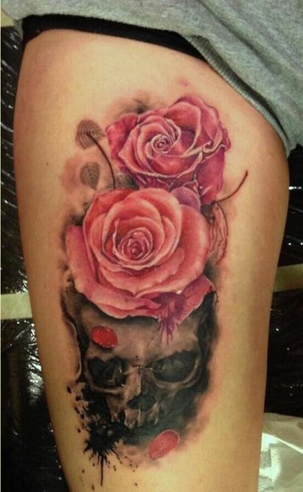 女生腿部骷髅玫瑰纹身图案欣赏图片