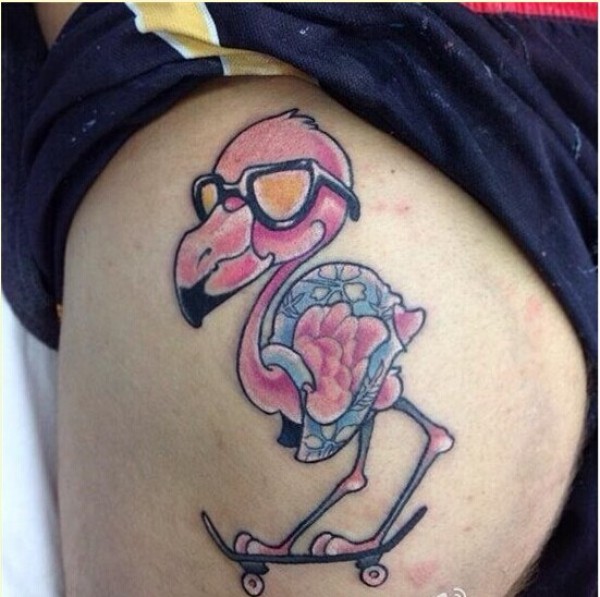 漂亮女生腿部滑板火烈鸟纹身图案分享图片