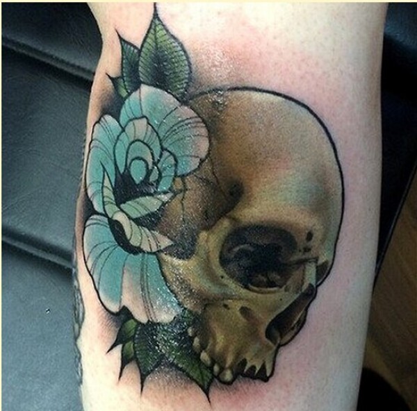 女生手臂经典潮流的骷髅与玫瑰花纹身图案