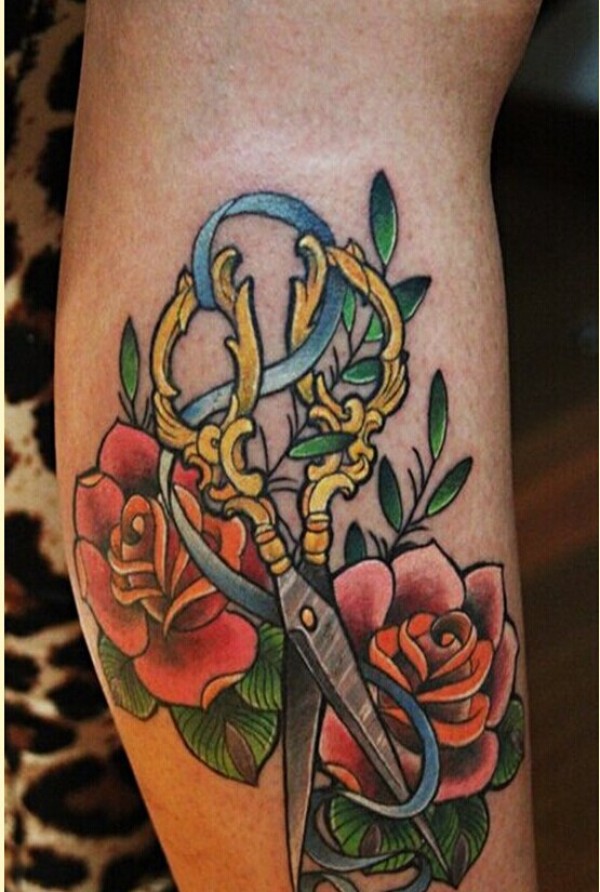 个性腿部剪刀玫瑰花纹身图案分享图片
