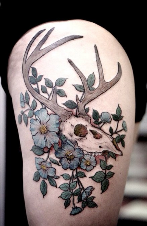 时尚女生腿部个性鹿骷髅头花纹身图片图片