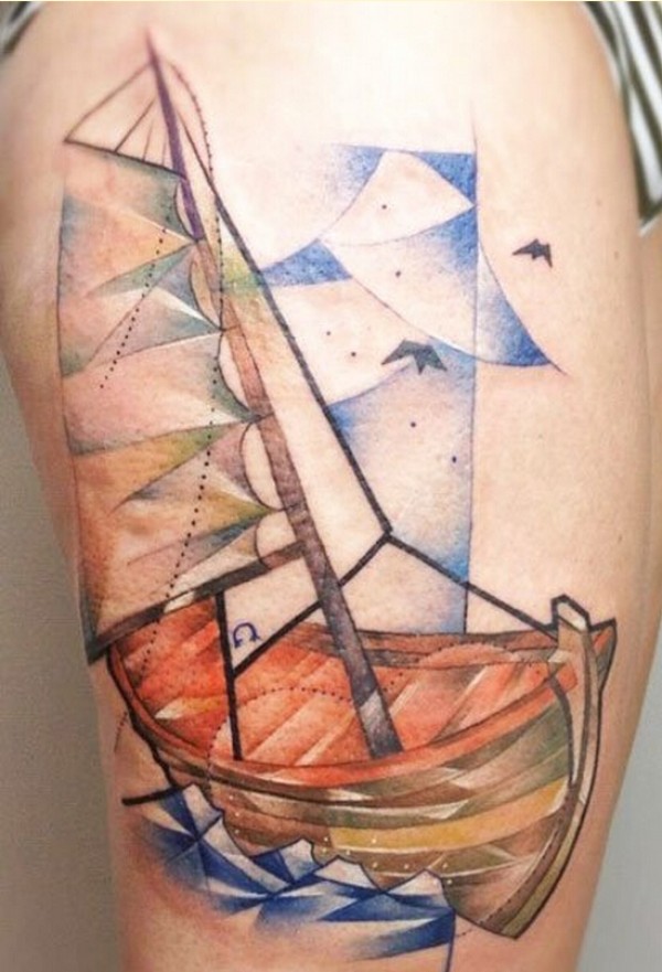 个性腿部时尚彩色帆船纹身图案