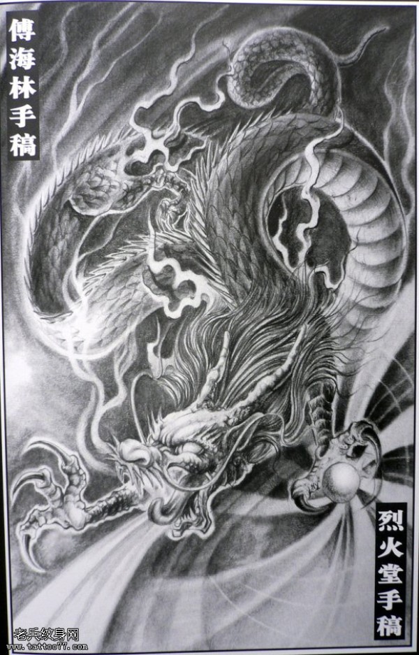龙纹身手稿_一组老传统黑灰龙手稿纹身图案
