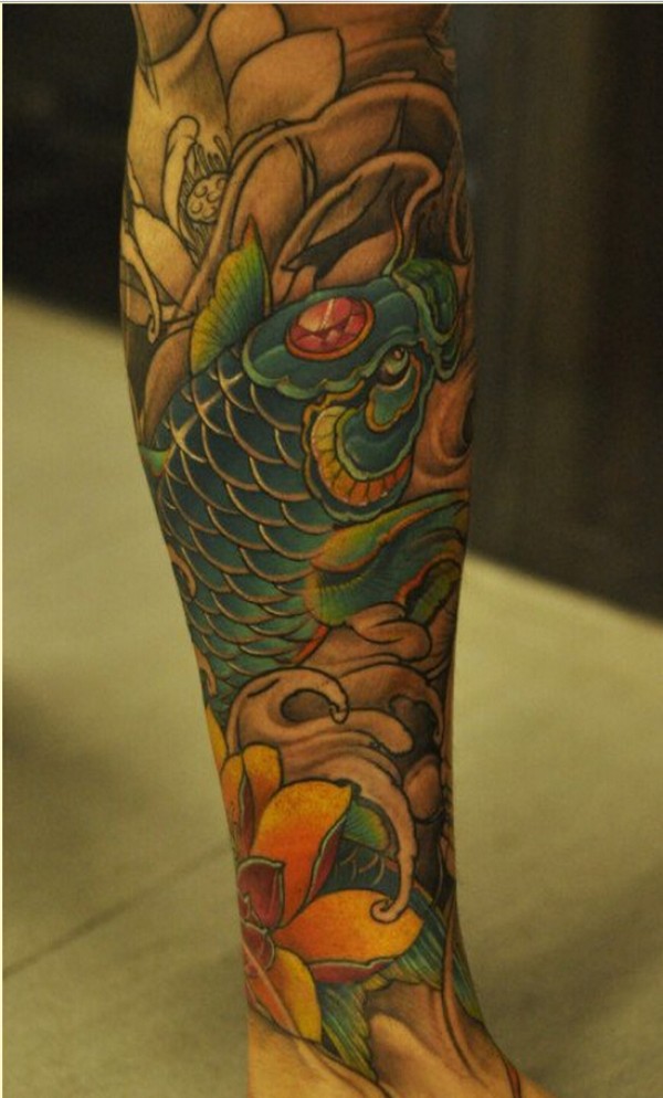 传统鲤鱼花小腿纹身_腿部纹身图案大全_纹身图吧
