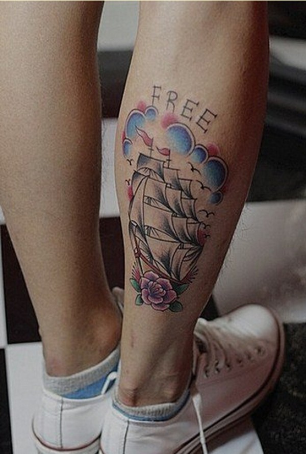 时尚漂亮腿部好看的帆船玫瑰花纹身图图片