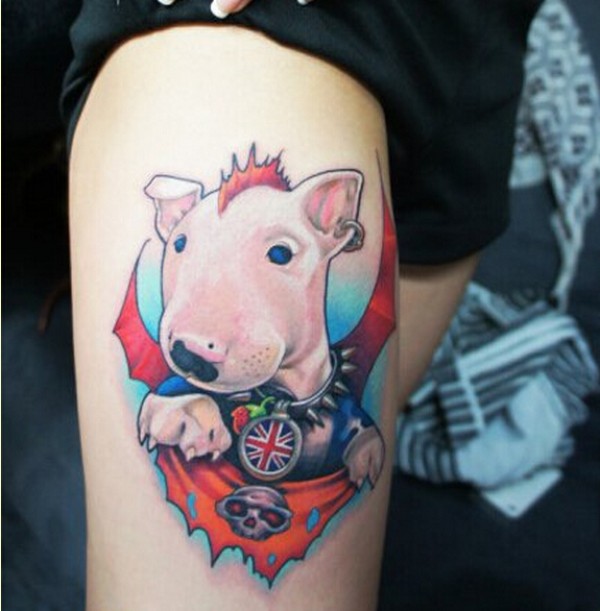 女生腿部漂亮的彩色小牛头梗纹身图案