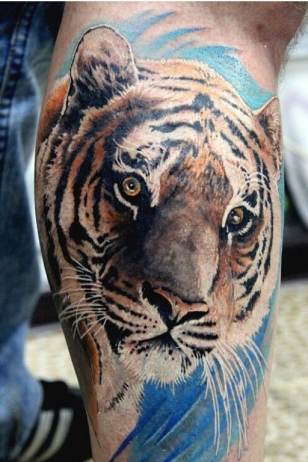 男人腿部经典时尚好看的彩色虎头纹身图片
