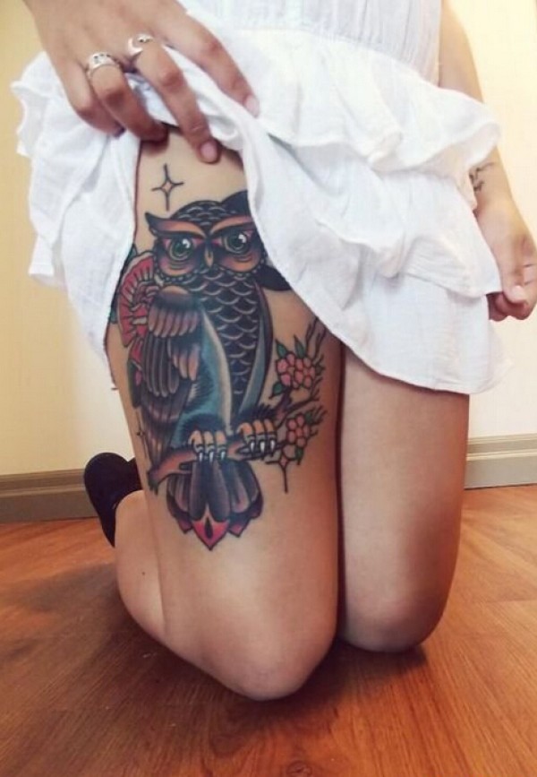 女生腿部个性时尚好看的猫头鹰纹身图图片