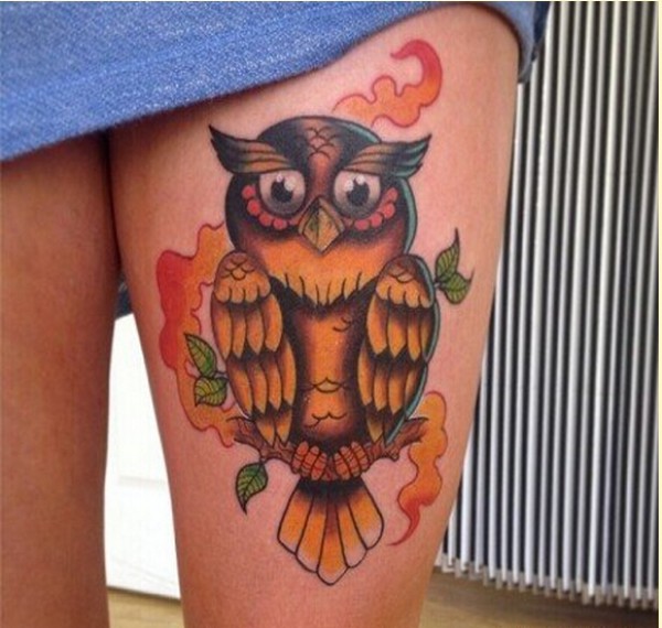 个性腿部时尚好看的彩色猫头鹰纹身图图片