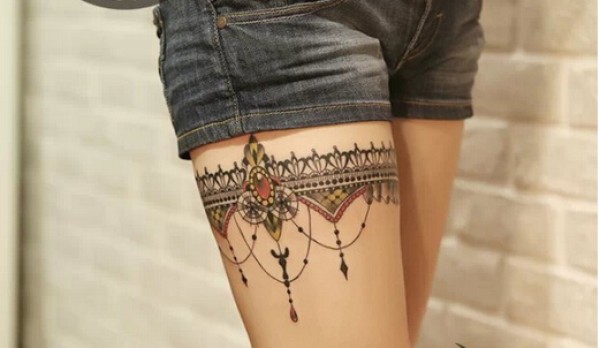 美女大腿漂亮精美好看的蕾丝脚链纹身图片