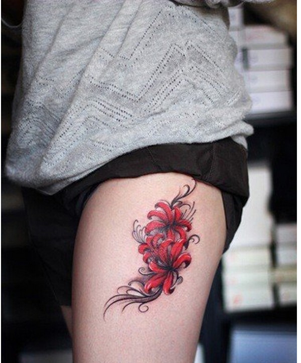 女生腿部唯美漂亮的彩色彼岸花纹身图图片