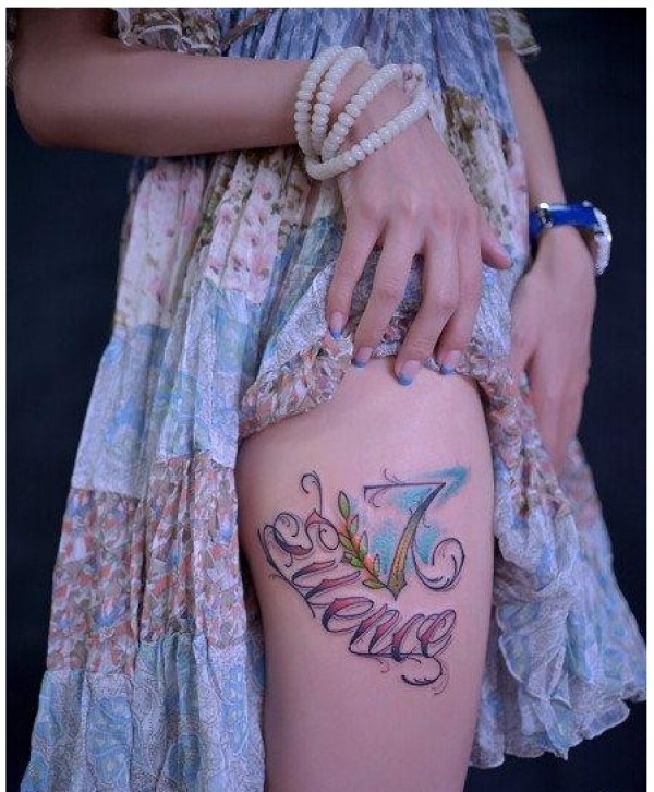 腿部前卫唯美好看的彩色花体字母纹身图片