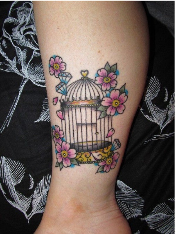 小腿上部漂亮好看的鸟笼花朵纹身图案