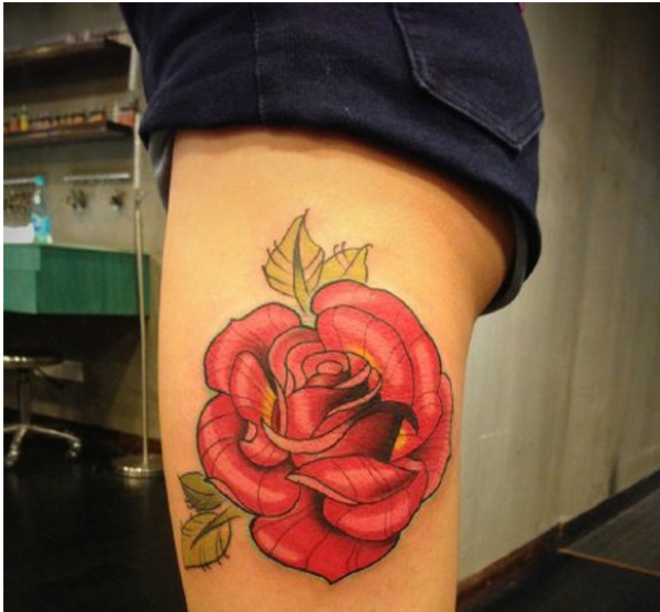 腿部漂亮好看的彩色玫瑰花纹身图片图片