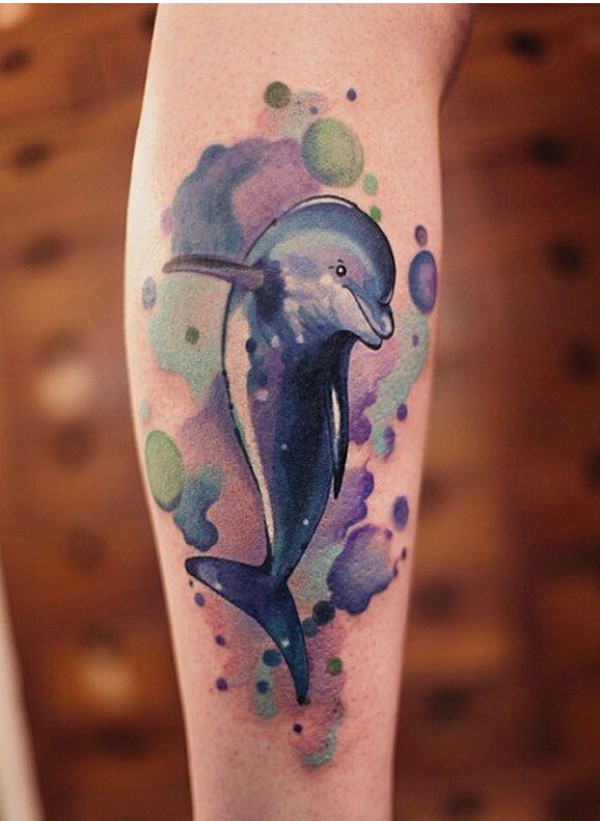 腿部上时尚好看的彩色泼墨鲸鱼纹身图图片