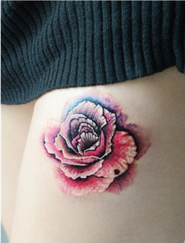 女生腿部唯美好看的彩色泼墨玫瑰纹身图片