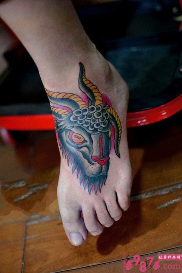 脚背霸气羊角头纹身图片