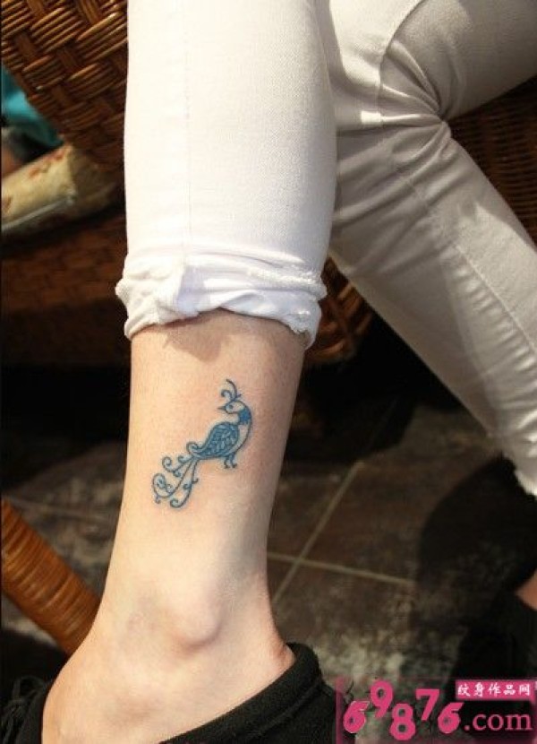 可爱蓝色小孔雀脚踝纹身图片