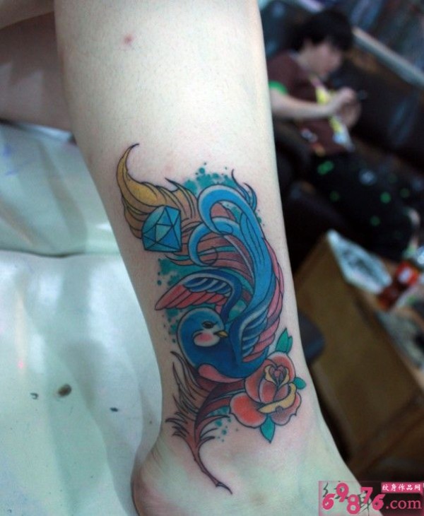 彩色燕子羽毛个性脚踝纹身图片