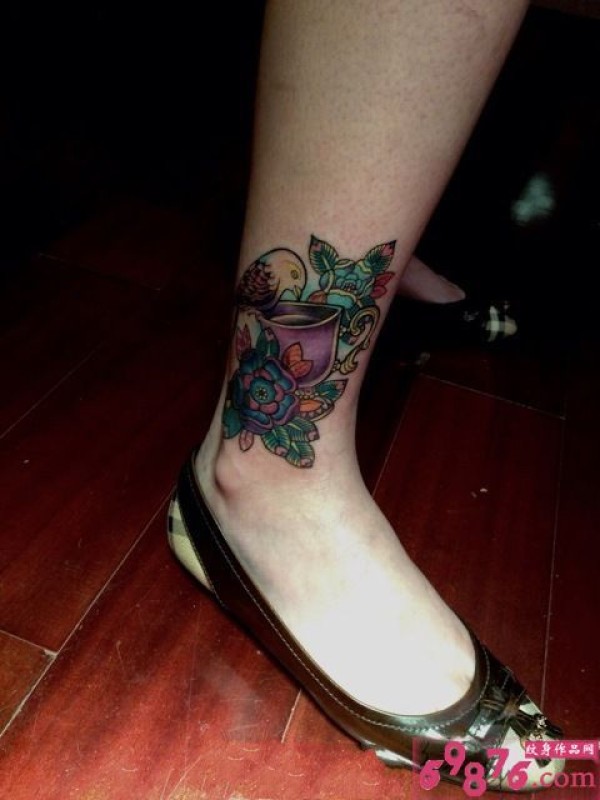 创意鲜花与鸟脚踝纹身图片