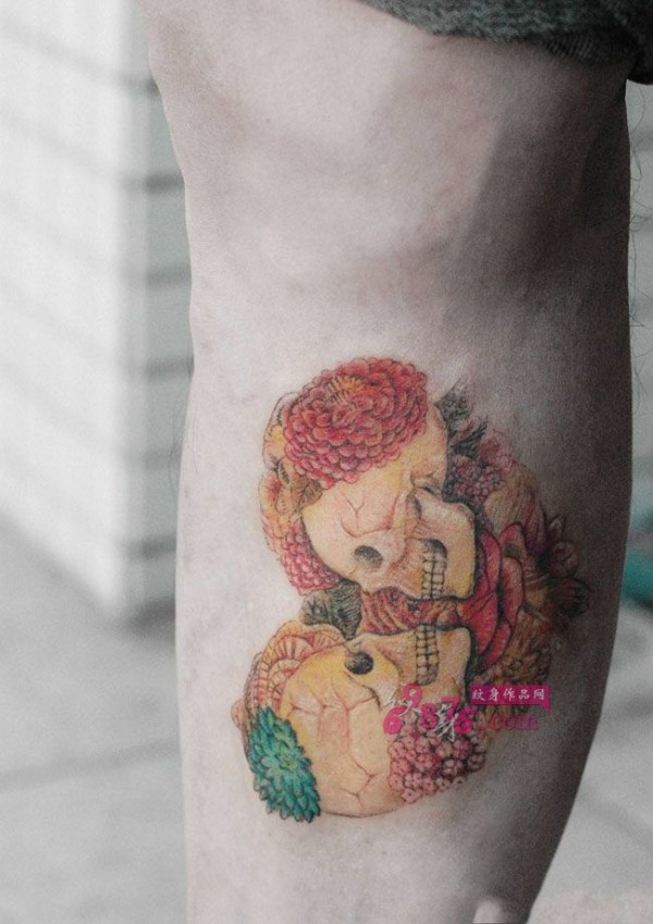 双生骷髅小腿纹身图片