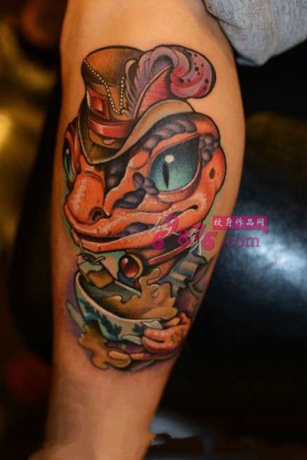 重彩小恐龙小腿纹身图片