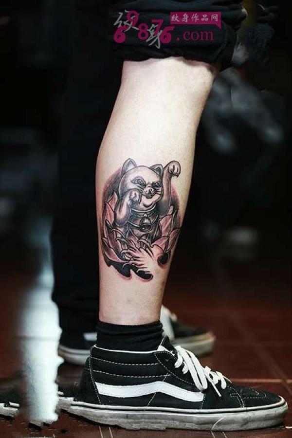素描风招财猫小腿纹身图片