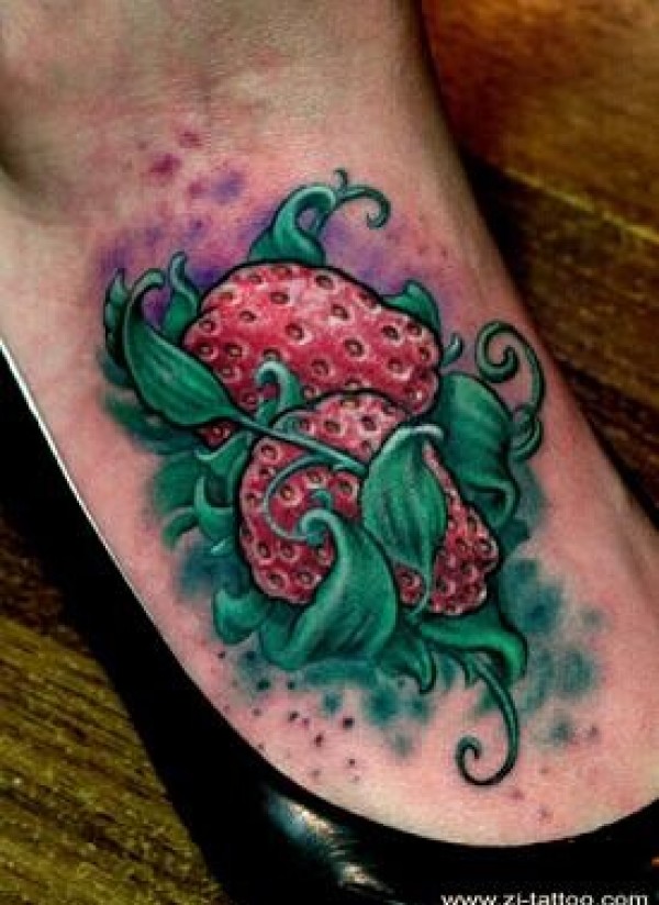 女生脚部的草莓纹身图案