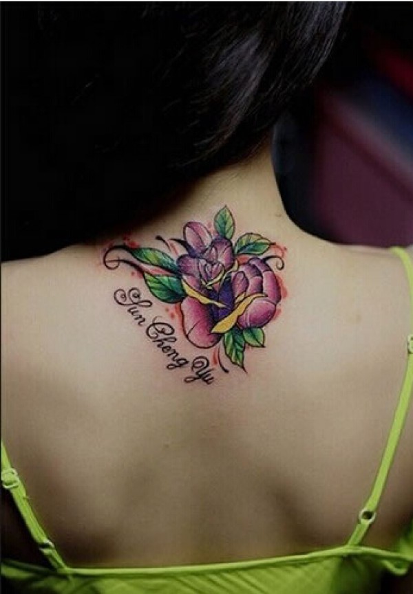 美女后颈娇艳唯美好看的鲜花彩色纹身图片