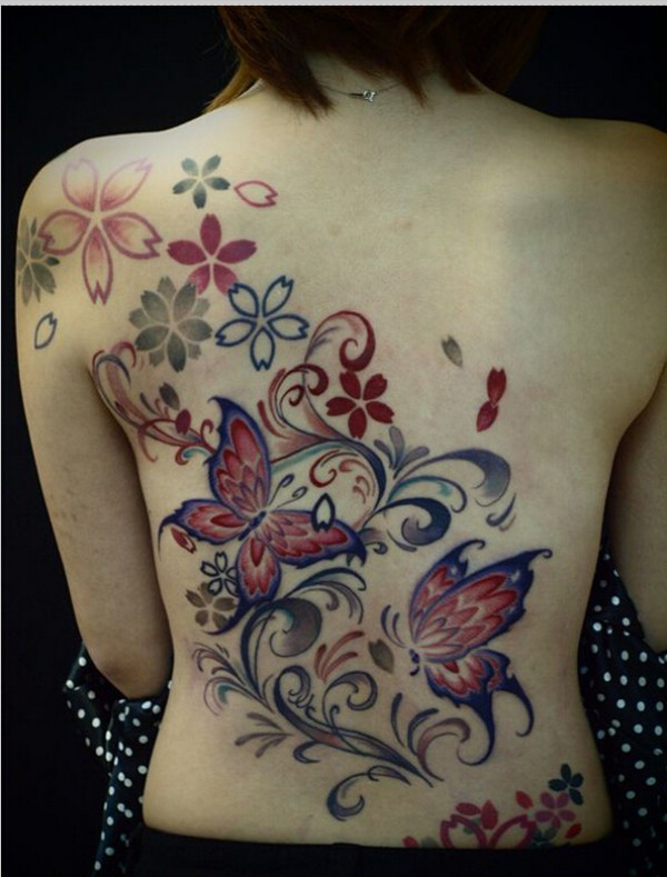 女孩后背唯美好看的蝴蝶藤蔓花纹身图图片