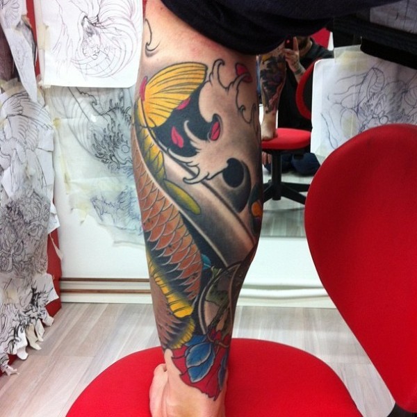 传统鲤鱼花小腿纹身_腿部纹身图案大全_纹身图吧