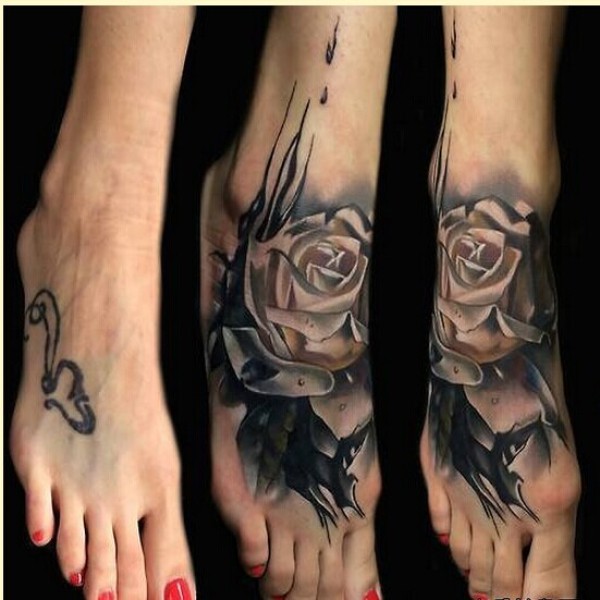 一款女生脚背黑灰玫瑰花纹身图案分享图片