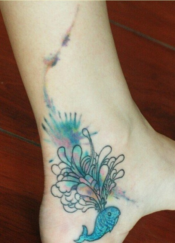时尚脚踝漂亮彩色泼墨金鱼纹身图片图片