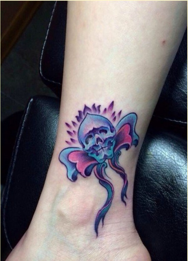 时尚女生脚踝个性彩色骷髅蝴蝶结纹身图片