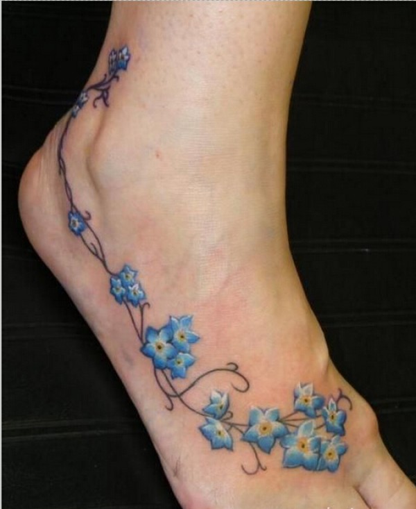 脚背上漂亮好看的蓝色小花藤纹身图案