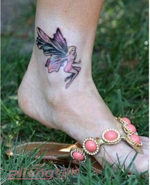 漂亮脚踝上时尚飞舞的小天使纹身图案
