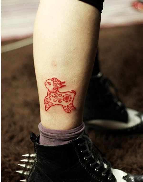 女生脚部唯美好看的红色图腾小羊纹身图片