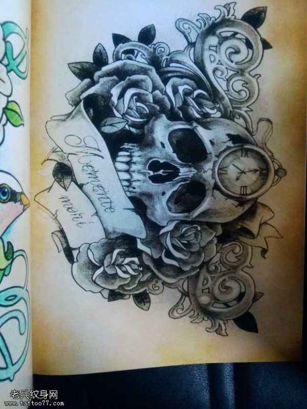 黑灰色玫瑰花和骷髅头纹身图片手稿