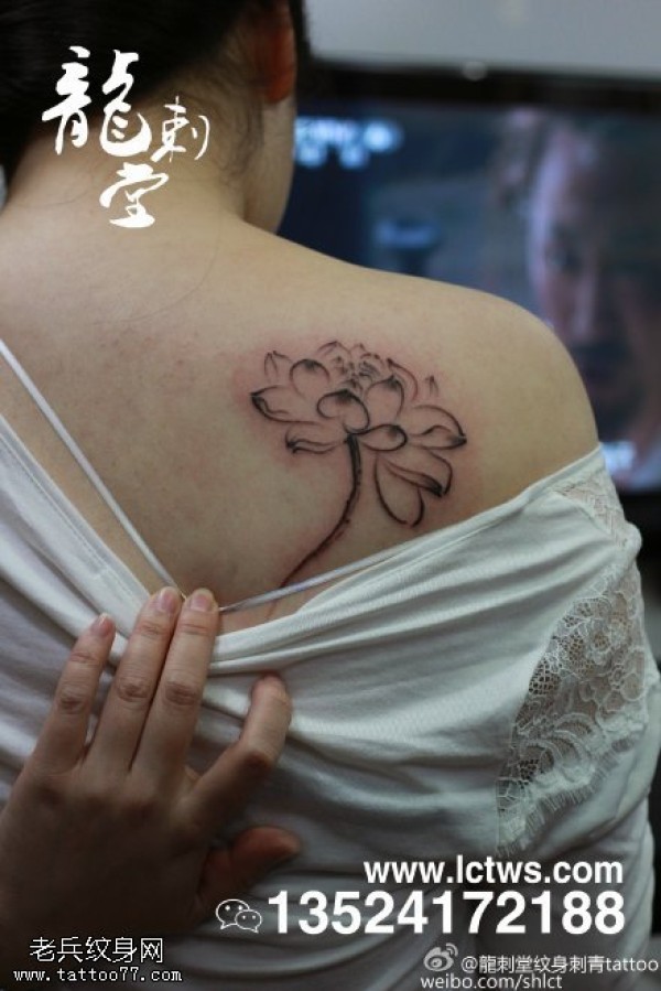肩部栩栩如生荷花点刺纹身图案