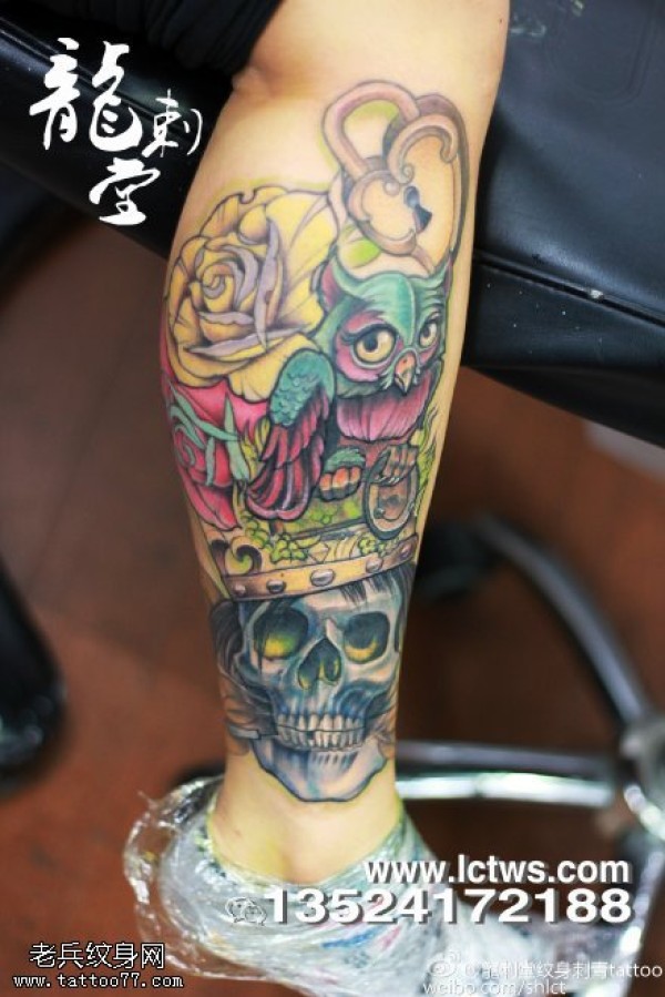 腿部彩色慵懒猫头鹰纹身图案