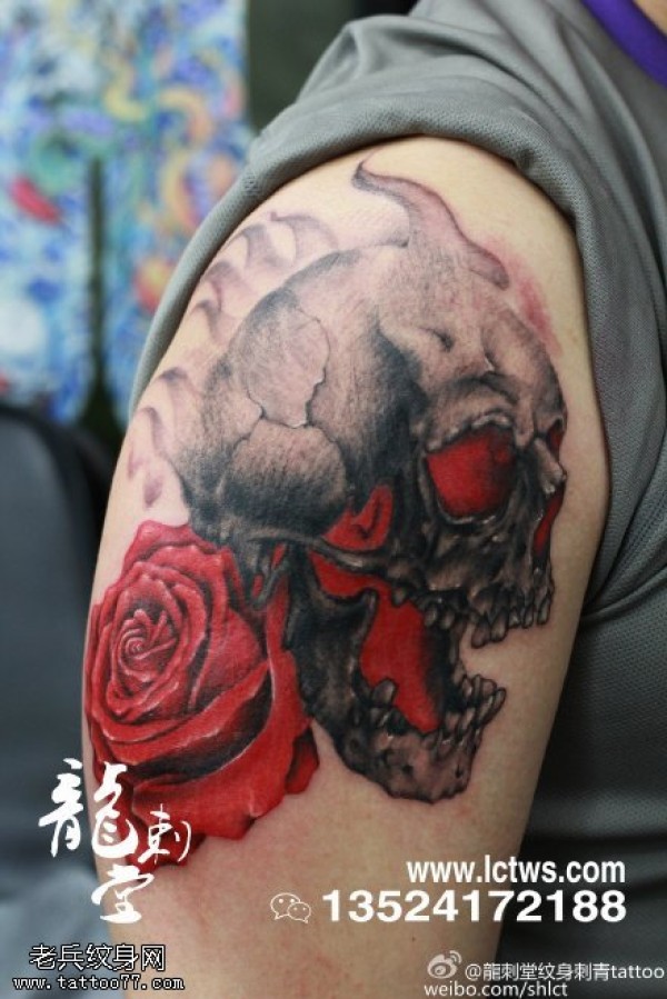 胳膊赤红色诡异玫瑰花骷髅纹身图案