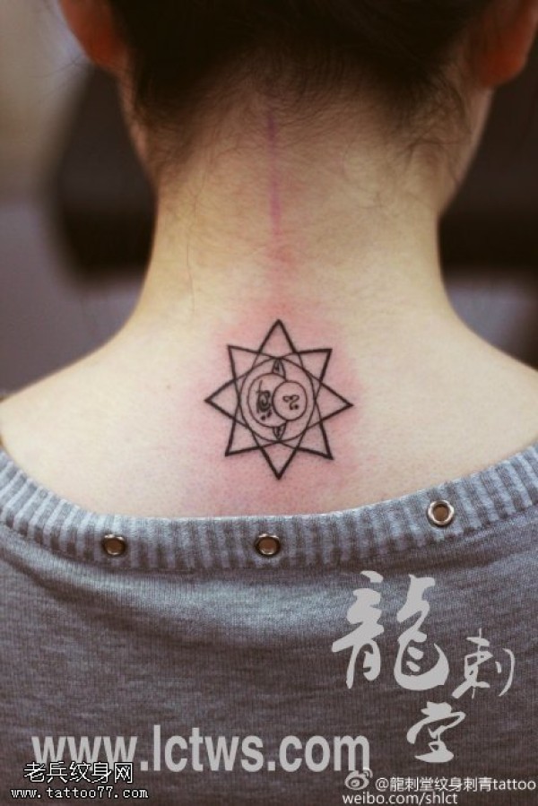 背部点刺镂空梵月纹身图案