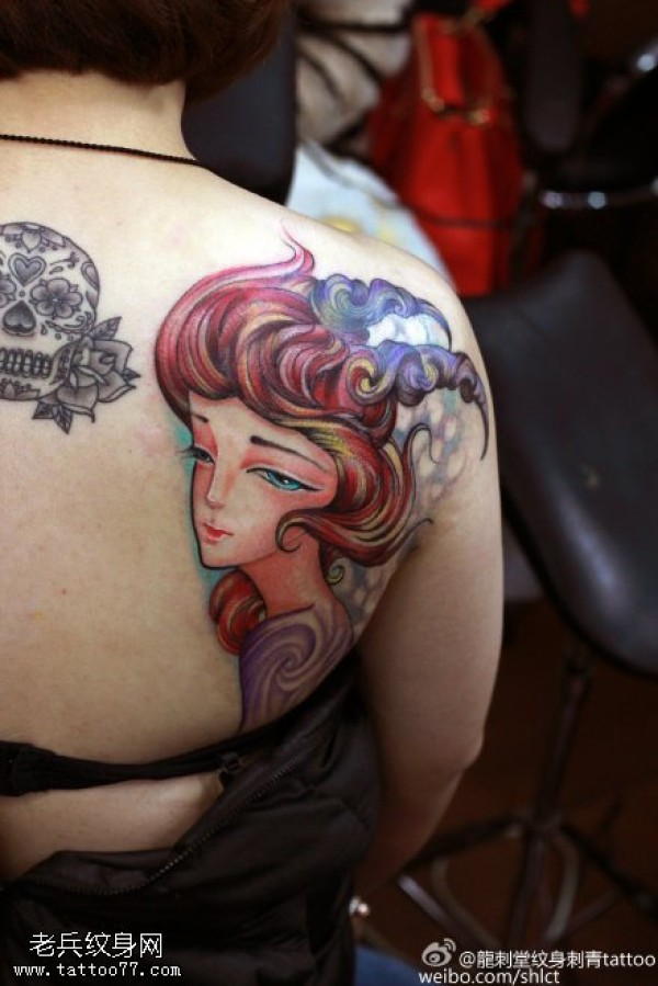 肩头水彩画抽象小女孩纹身图案