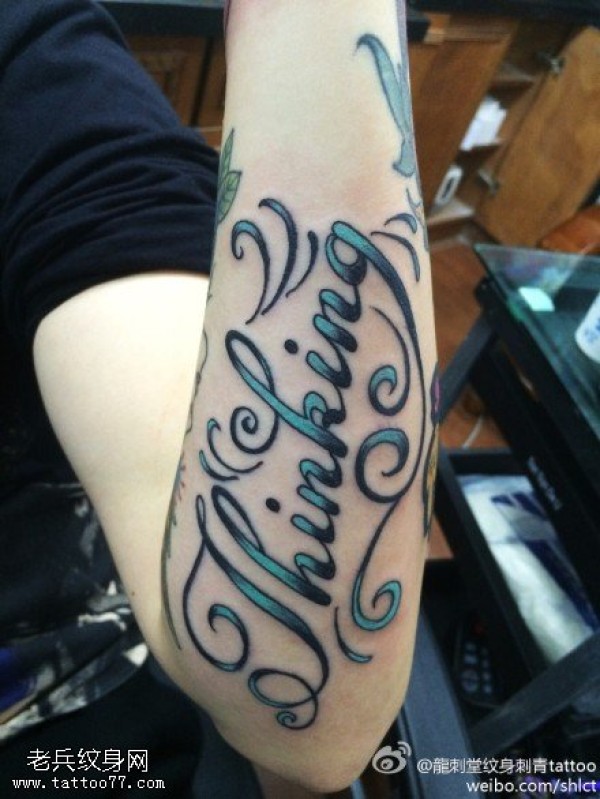 手臂宝蓝色英文花体纹身图案