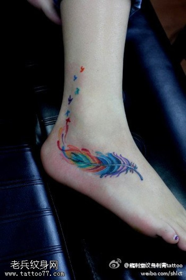 脚部彩色灵动飘逸羽毛纹身图案