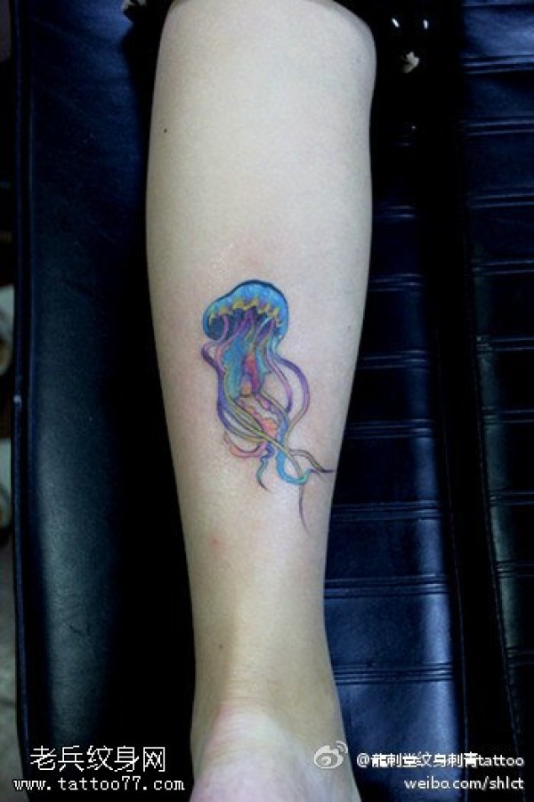 腿部水母彩色纹身图案