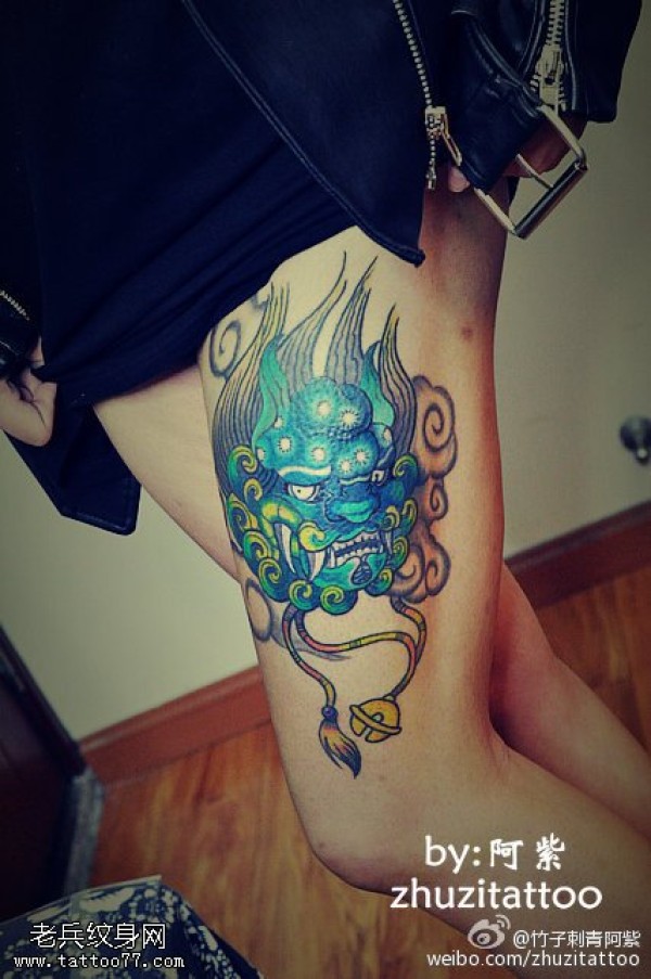 腿部宝蓝色美丽麒麟纹身图案