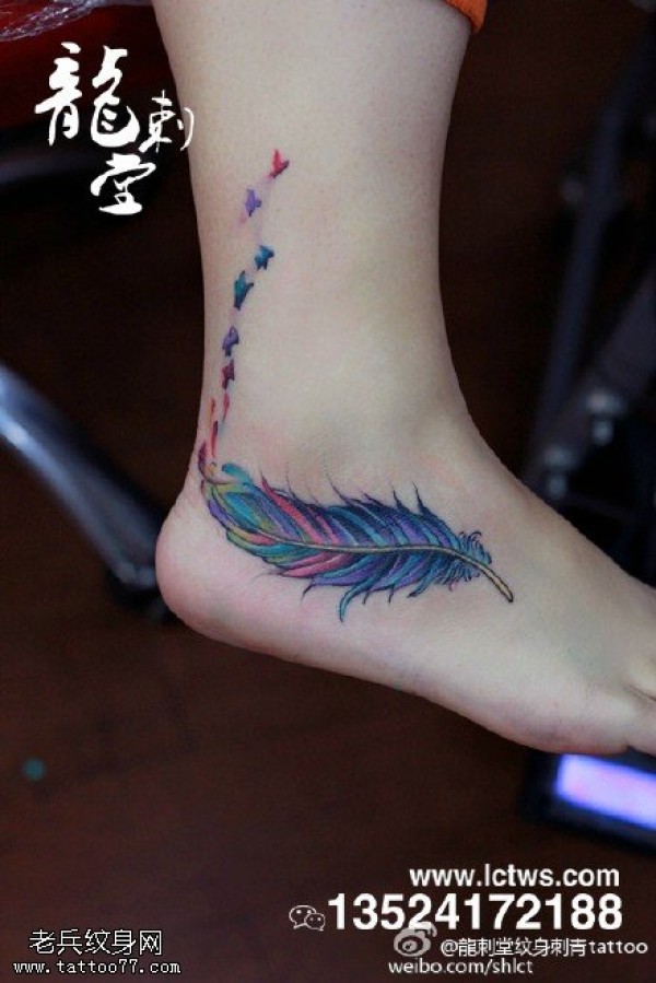 脚部羽毛五彩斑斓纹身图案