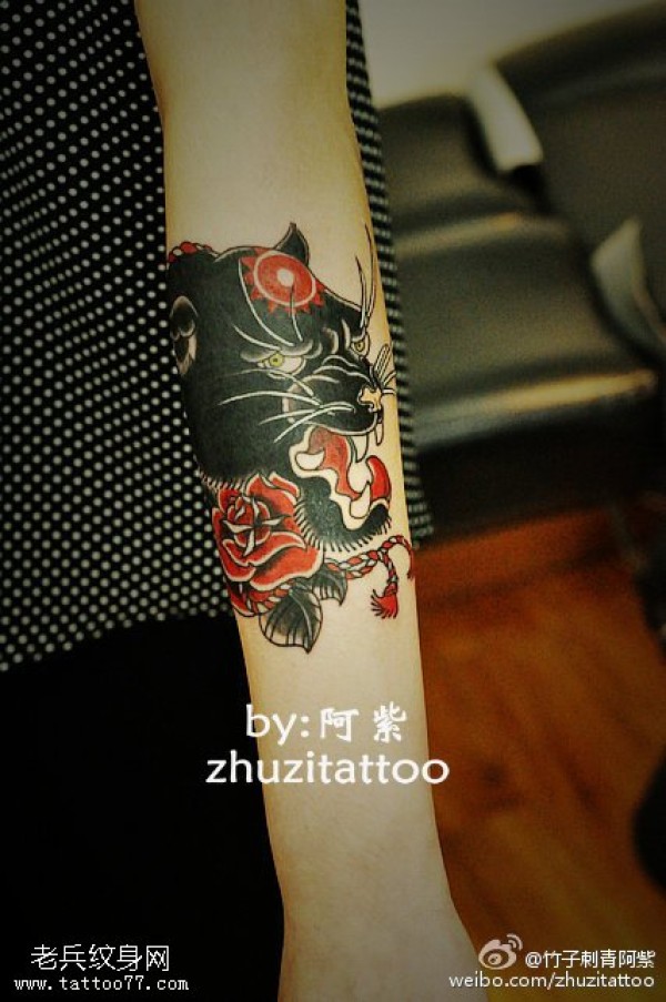 胳膊黑色发亮豹子纹身图案