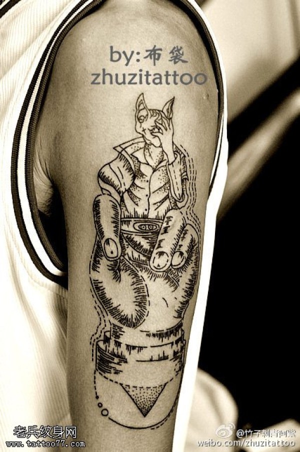 胳膊点刺上帝之手猫咪纹身图案